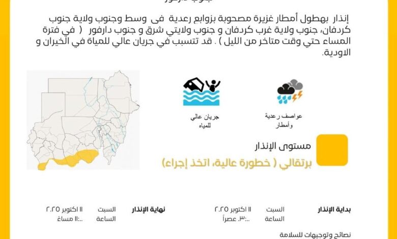 بورتسودان 11-10-2025 (سونا)- أصدرت الهيئة العامة للأرصاد الجوية اليوم إنذاراً باللون البرتقالي من خطورة عالية في كل من وسط وجنوب ولاية جنوب كردفان، جنوب ولاية غرب كردفان و جنوب ولايتي شرق و جنوب دارفور، حيث يُتوقع هطول أمطار غزيرة مصحوبة بعواصف رعدية قد تتسبب في جريان عالي للمياه في المناطق المنخفضة والأودية .