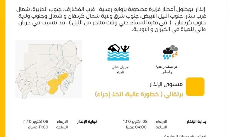 بورتسودان 8-10-2025 (سونا)- أصدرت الهيئة العامة للأرصاد الجوية اليوم إنذاراً باللون البرتقالي من خطورة عالية في كل من غرب القضارف، جنوب الجزيرة، شمال غرب سنار، جنوب النيل الابيض، جنوب شرق ولاية شمال كردفان وشمال وجنوب ولاية جنوب كردفان، حيث يُتوقع هطول أمطار غزيرة مصحوبة بعواصف رعدية .